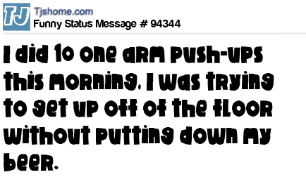X says I did 10 one arm push-ups this morning, I was trying to get up off of the floor without putting down my beer.