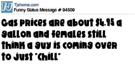 - # 93396 Gas prices are about $3.95 a gallon and females still think guys are coming over to just "CHILL"