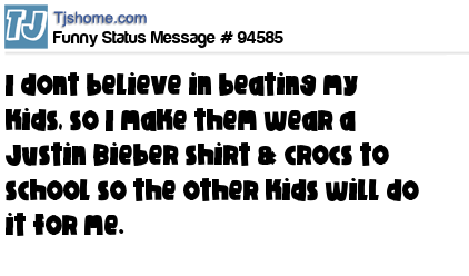 X I dont believe in beating my kids, so I make them wear a Justin Bieber shirt & crocs to school so the other kids will do it for me.