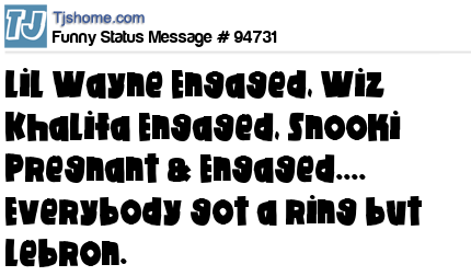X Lil Wayne Engaged, Wiz Khalifa Engaged, Snooki Pregnant & Engaged.... Everybody got a ring but Lebron.
