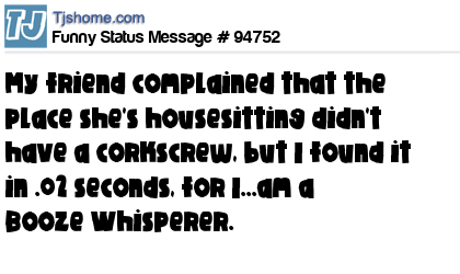 X My friend complained that the place she's housesitting didn't have a corkscrew, but I found it in .02 seconds, for I...am a Booze Whisperer.
