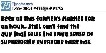 X Been at this farmer's market for an hour,,, Still can't find the guy that sells the smug sense of superiority everyone here has.