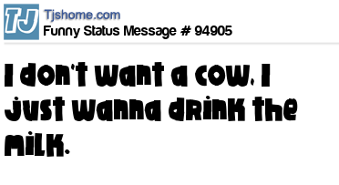 - # 4837 The more you think about things, the weirder they seem. Take this milk. Why do we drink *cow* milk?? Who was the guy who first looked at a cow and said, "I think I'll drink whatever comes out of these things when I squeeze 'em.