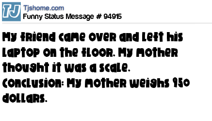 X My friend came over and left his laptop on the floor. My mother thought it was a scale. Conclusion: My mother weighs 950 dollars.