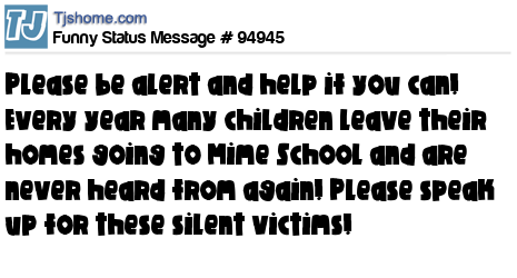 X says Please be alert and help if you can! Every year many children leave their homes going to Mime School and are never heard from again! Please speak up for these silent victims!