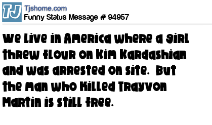 X says We live in America where a girl threw flour on Kim Kardashian and was arrested on site. But the man who killed Trayvon Martin is still free.