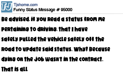X Be advised, if you read a status from me pertaining to driving, that I have safely pulled the vehicle safely off the road to update said status. Why? Because dying on the job wasn't in the contract. That is all