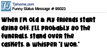 - # 95035 When I get old and my friends start dying off, I'll probably go the funerals; stand over the caskets and whisper "you should have forwarded that e-mail to 12 friends..."