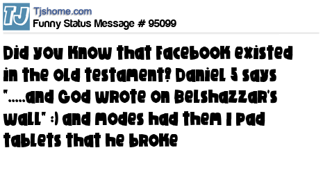 X Did you know that Facebook existed in the old testament? Daniel 5 says ".....and God wrote on Belshazzar's wall" :) and modes had them I pad tablets that he broke