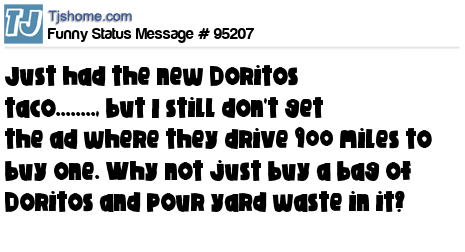 X has just had the new Doritos taco........, but I still don't get the ad where they drive 900 miles to buy one. Why not just buy a bag of Doritos and pour yard waste in it?