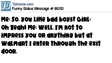 - # 96084 Boy: So, you like bad boys? Girl: Oh Yeah! Boy: Well, I'm not to impress you or anything but at Walmart I enter through the exit door.