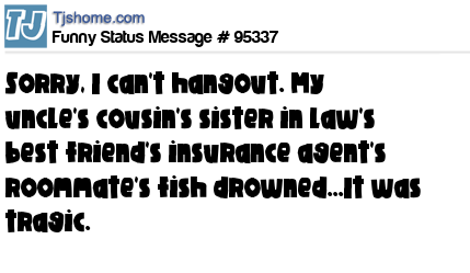 - # 85131 Sorry, I can't hangout. My uncle's cousin's sister in law's best friend's insurance agent's roommate's pet goldfish died. Maybe next time..