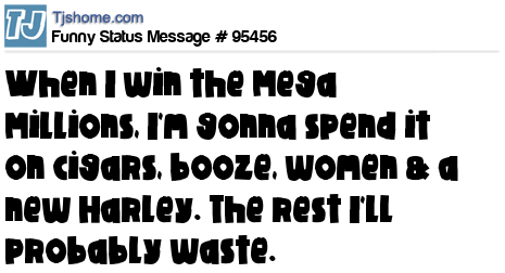 X  When I win the Mega Millions, I'm gonna spend it on cigars, booze, women & a new Harley. The rest I'll probably waste.
