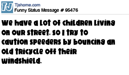 - # 65210 We have a lot of children living on our street, so I try to caution speeders by bouncing an old tricycle off their windshield