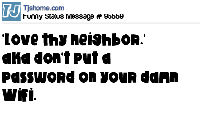 - # 72531 The bible say, "thou shalt love thy neighbor" which means, take your password off your wifi!!