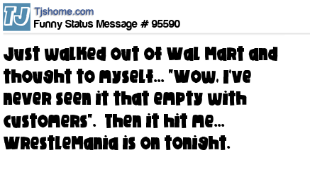 X  Just walked out of Wal Mart and thought to myself... "Wow, I've never seen it that empty with customers".  Then it hit me... WrestleMania is on tonight.