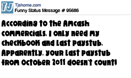 X According to the Amcash commercials, I only need my checkbook and last paystub. Apparently, your last paystub from October 2011 doesn't count!