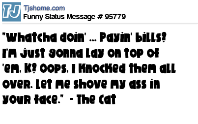 X "Whatcha doin' ... Payin' bills? I'm just gonna lay on top of 'em, K? Oops, I knocked them all over. Let me shove my ass in your face." - The Cat