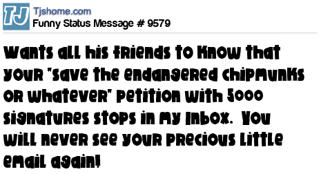 X wants all his friends to know that your "save the endangered chipmunks or whatever" petition with 5000 signatures stops in my Inbox. You will never see your precious little email again!