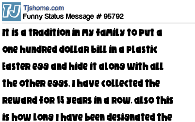 X It is a tradition in my family to put a one hundred dollar bill in a plastic Easter egg and hide it along with all the other eggs. I have collected the reward for 15 years in a row, also this is how long I have been designated the "hider."