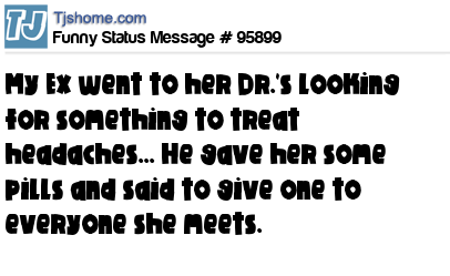 X My Ex went to her Dr.'s looking for something to treat headaches... He gave her some pills and said to give one to everyone she meets.