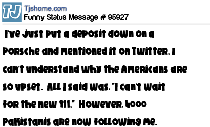 X I've just put a deposit down on a Porsche and mentioned it on Twitter. I can't understand why the Americans are so upset. All I said was, "I can't wait for the new 911." However, 4000 Pakistanis are now following me.