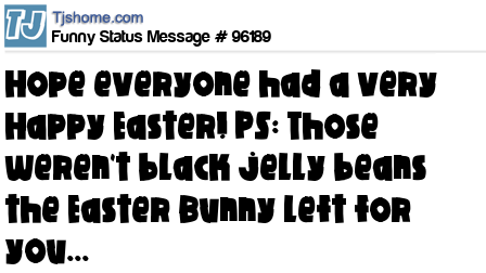 X Hope everyone had a very Happy Easter! PS: Those weren't black jelly beans the Easter Bunny left for you...