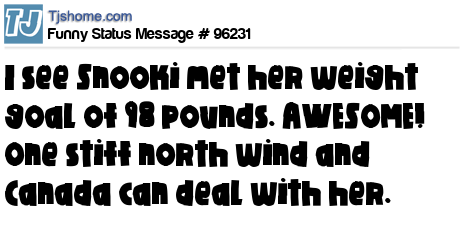 X I see Snooki met her weight goal of 98 pounds. AWESOME! One stiff north wind and Canada can deal with her.