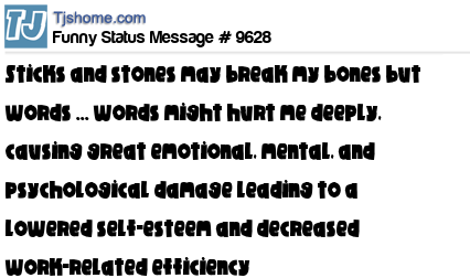 - # 122248 Sticks and stones may break my bones but words... words might hurt me deeply, causing great emotional, mental, and psychological damage leading toward a lowered self-esteem and irregular bowel movements ツ