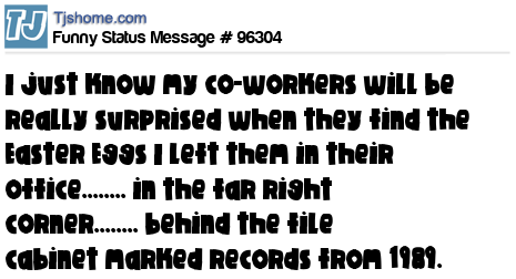 X I just know my co-workers will be really surprised when they find the Easter Eggs I left them in their office........ in the far right corner........ behind the file cabinet marked records from 1989.