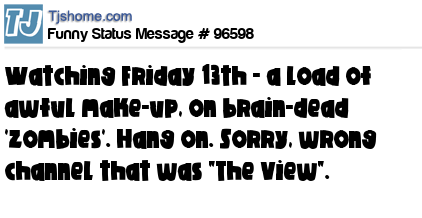 - # 182886 Watching Friday the 13th. A load of awful make-up on brain-dead zombies. Oh wait. Sorry, wrong channel. This is "The View".