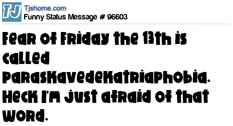 X Fear of Friday the 13th is called paraskavedekatriaphobia. Heck I'm just afraid of that word.
