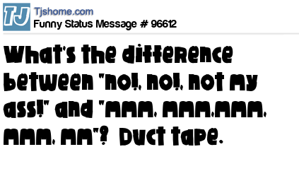 X is What's the difference between "no!, no!, not my ass!" and "mmm, mmm,mmm, mmm, mm"? Duct tape.