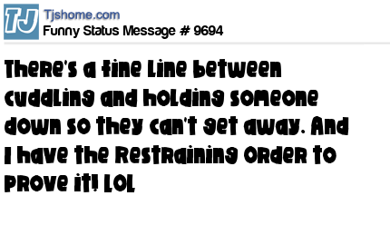 X says There's a fine line between cuddling and holding someone down so they can't get away. And I have the Restraining Order to prove it! LOL