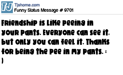 X Friendship is like peeing in your pants. Everyone can see it, but only you can feel it. Thanks for being the pee in my pants. : )