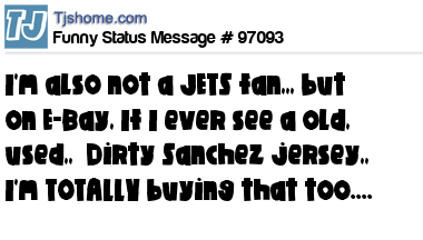X I'm also not a JETS fan,,, but on E-Bay, If I ever see a old, used,, Dirty Sanchez jersey,, I'm TOTALLY buying that too....