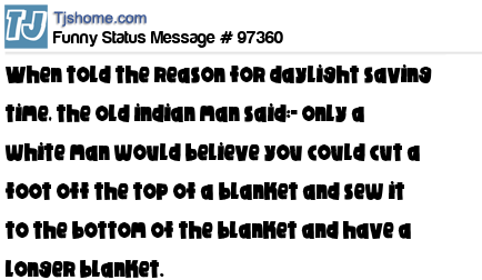- # 146622 An old Indian Chief was asked if they had Daylight Savings Time on the reservation. The old man replied "Only whyte man dumb enough to thing he can cut off the bottom of a blanket, sew it on the other end and think he has a longer blanket."