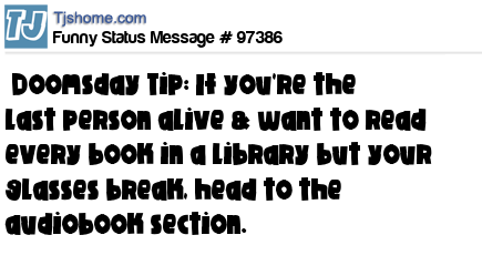 X says Doomsday Tip: If you're the last person alive & want to read every book in a library but your glasses break, head to the audiobook section.