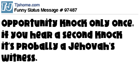 - # 120759 A Jehova Witness tried to tell me a "Knock Knock" joke, but got all mad cause I didn't answer him.