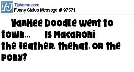 - # 97377 Yankee Doodle went to town riding on a pony; he stuck a feather in his hat, and called it macaroni... That folks, is what drugs do to you.