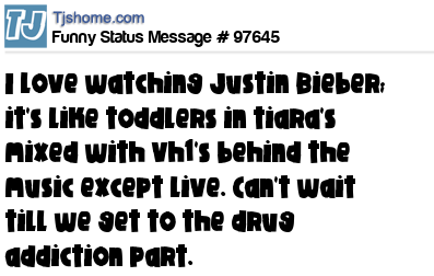 X  I love watching Justin Bieber; it's like toddlers in tiara's mixed with Vh1's behind the music except live. Can't wait till we get to the drug addiction part.