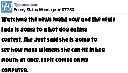 X  Watching the news right now and the news lady is going to a hot dog eating contest. She just said she is going to see how many wieners she can fit in her mouth at once. I spit coffee on my computer.