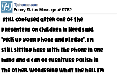 X still confused after one of the presenters on Children in Need said, "pick up your phone and pledge". I'm still sitting here with the phone in one hand and a can of furniture polish in the other, wondering what the hell I'm supposed to do next.