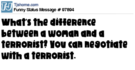 X What's the difference between a woman and a terrorist? You can negotiate with a terrorist.