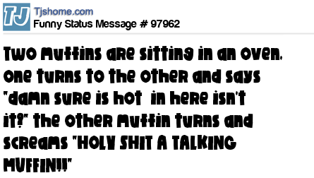 X two muffins are sitting in an oven, one turns to the other and says "damn sure is hot in here isn't it?" the other muffin turns and screams "HOLY SHIT A TALKING MUFFIN!!"