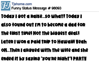 X says today I got a raise...so what? Today I also found out I'm to become a dad for the first time! Not the biggest deal! Later I won a paid trip to Hawaii! Yeah ok...Then I argued with the wife and she ended it by saying "you're right"! PARTY AT MY PLACE!
