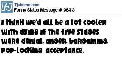 X says I think we'd all be a lot cooler with dying if the five stages were denial, anger, bargaining, pop-locking, acceptance.