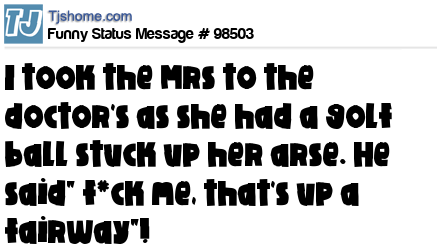 X I took the Mrs to the doctor's as she had a golf ball stuck up her arse. He said" f*ck me, that's up a fairway"!