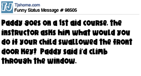 X Paddy goes on a 1st aid course, the instructor asks him what would you do if your child swallowed the front door key? Paddy said i'd climb through the window.