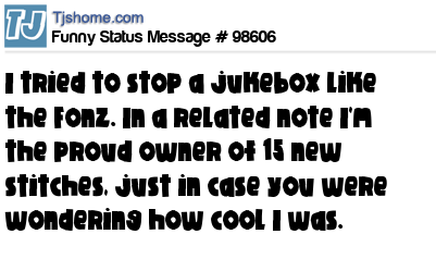 X  I tried to stop a jukebox like the Fonz. In a related note I'm the proud owner of 15 new stitches, just in case you were wondering how cool I was.